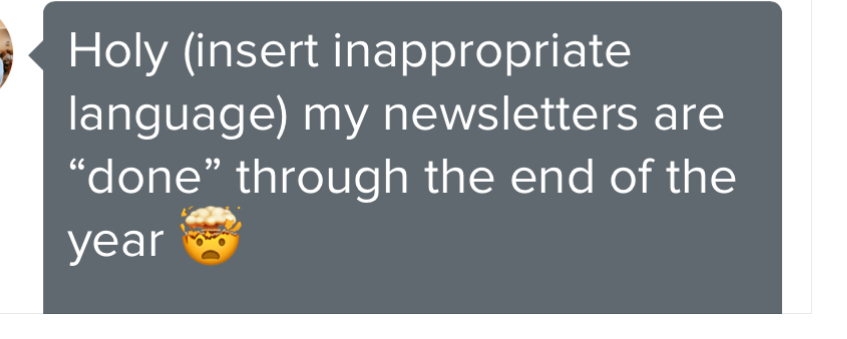 What kinds of words would YOU say if your newsletters were done and scheduled for the next 16 weeks?