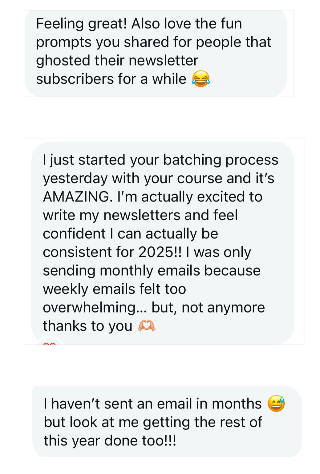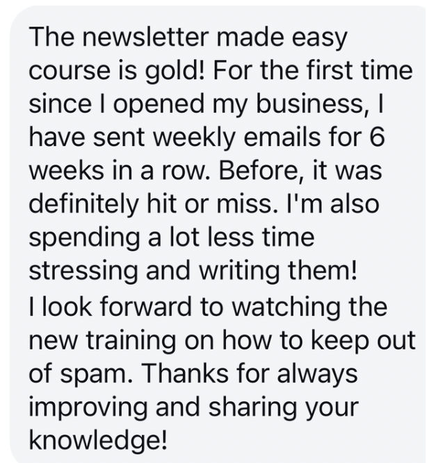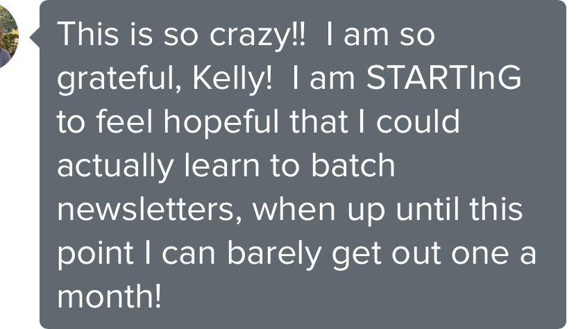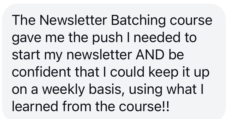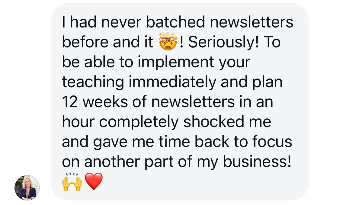 No fluff. No hour-long videos. Just clear, direct steps that walk you through batching your next quarter of newsletters - with ease. Nearly everyone who buys the course has their newsletters batched and scheduled the same day they bought the course!